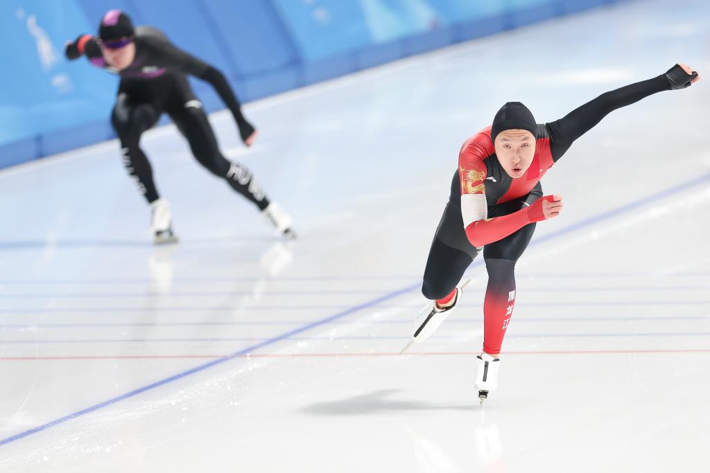 Chinese skater Xiao Jinbao(R) competes in a test event of the Harbin Asian Winter Games at the Heilongjiang Ice Training Center on December 15, 2024. (Xinhua/Zhang Tao)