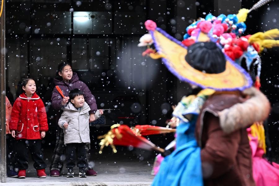 Children watch Lichuan Dengge performance on the street in Baiyangba Town, Lichuan City, Enshi Tujia and Miao Autonomous Prefecture, central China's Hubei Province, Feb. 6, 2025. (Xinhua/Du Zixuan)