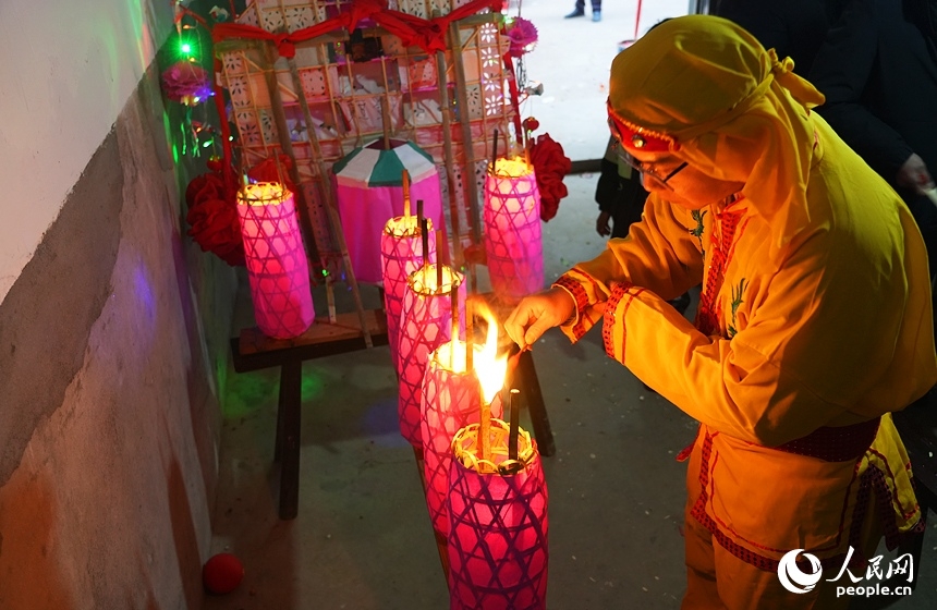 Hu Tao lights up lanterns with a candle before a lantern show kicks off in Tuanbei village, Anyi county, Nanchang city, east China's Jiangxi Province. (People's Daily Online/Mao Siyuan)