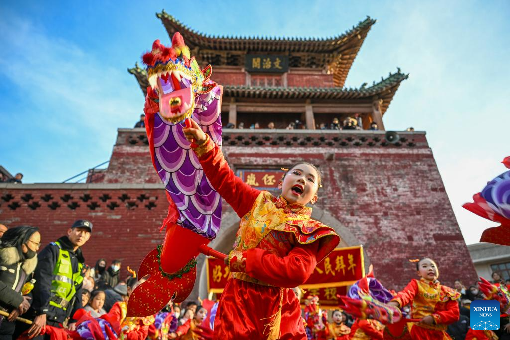 Folk artists perform a Yingge dance at a folk performance show celebrating the Lantern Festival in Handan City, north China's Hebei Province, Feb. 12, 2025. Various activities were held across China to celebrate the Lantern Festival, which falls on the fifteenth day of the first month of the Chinese lunar calendar. (Photo by Hao Qunying/Xinhua)