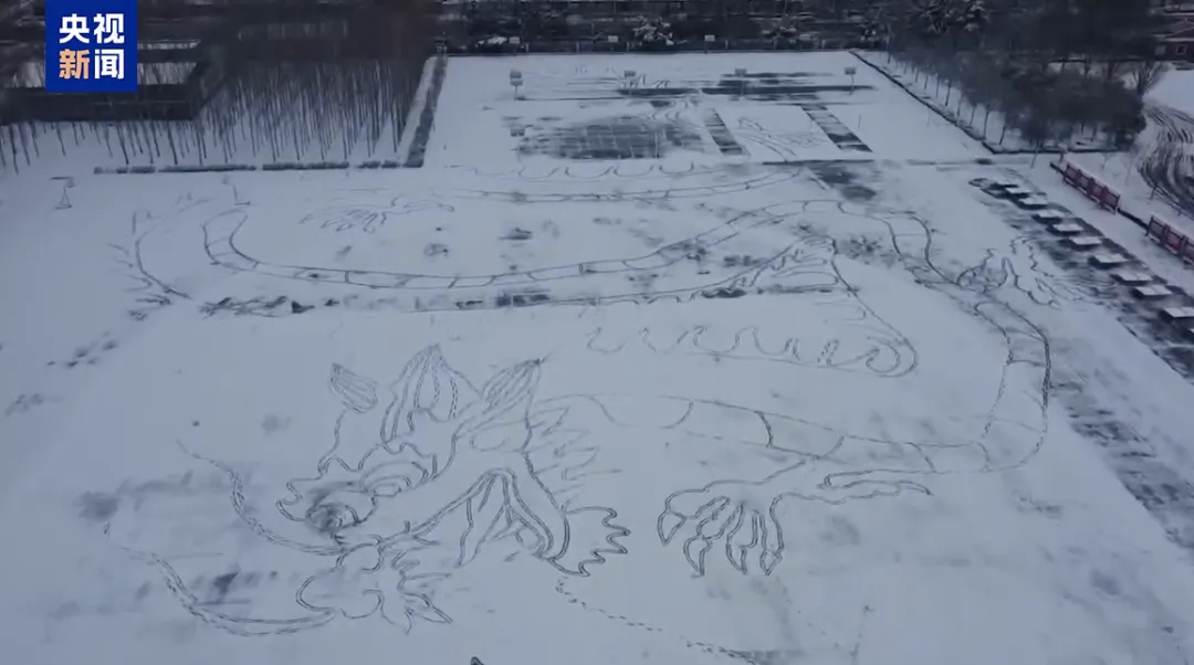 Photo shows a huge picture showing two dragons playing with a pearl. Shen Jingyu spent 5 hours walking over 30,000 steps on the snow-covered ground to create the picture. (Photo/CCTV News)