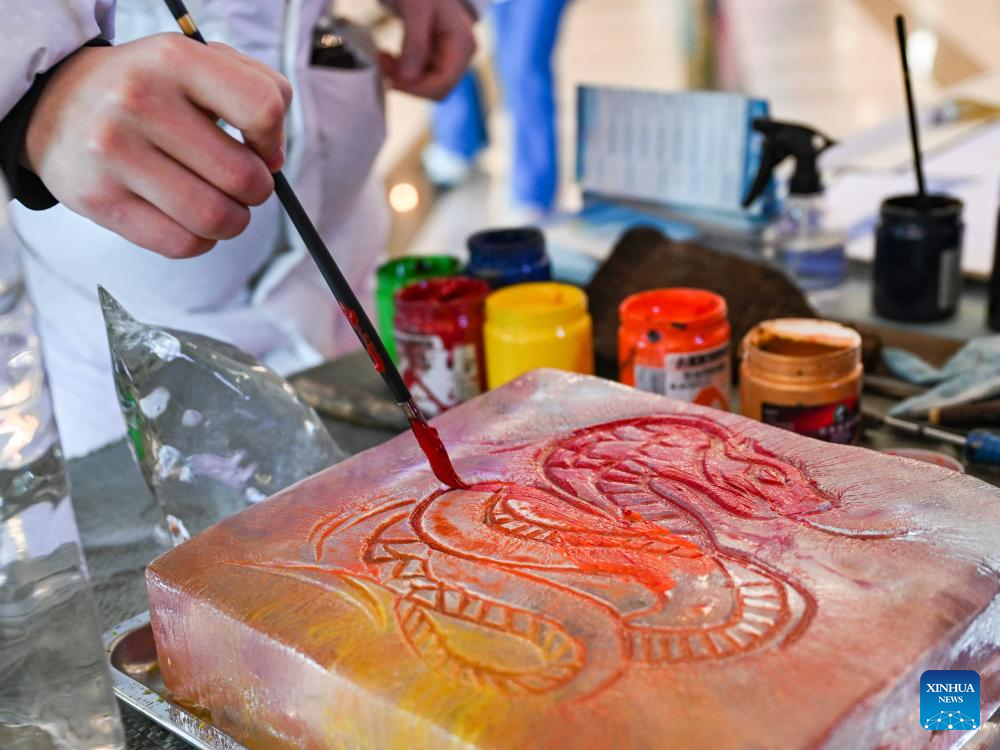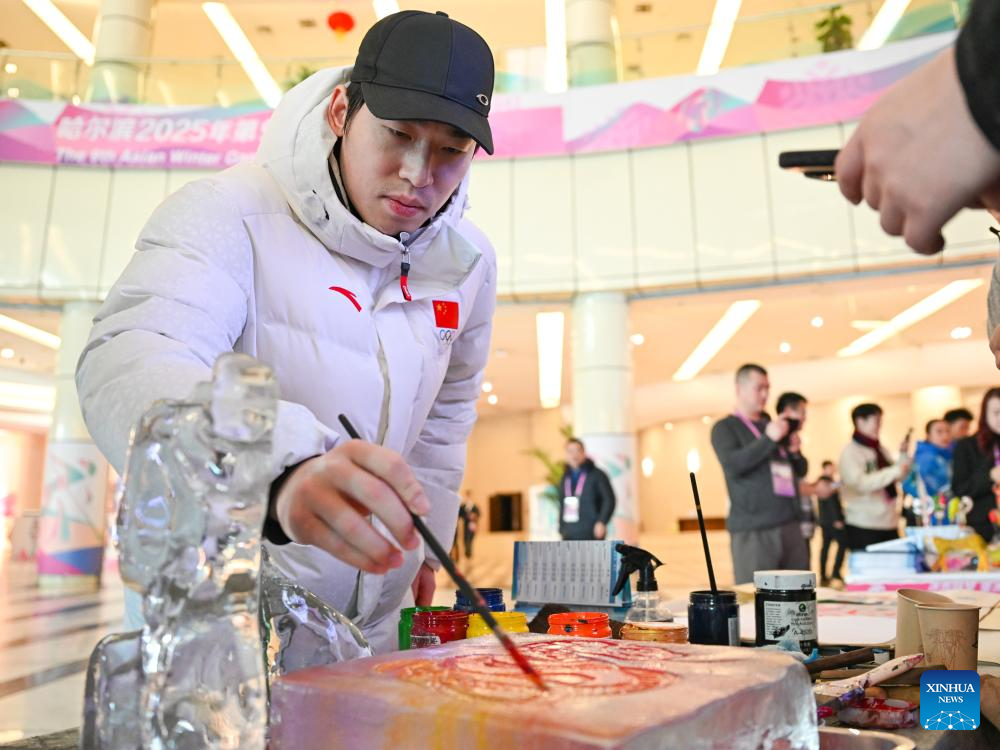 Ice hockey player Zhang Zesen of China tries the rubbing painting during a cultural event to celebrate the Lanter Festival at the athletes' village of the 9th Asian Winter Games in Harbin, northeast China's Heilongjiang Province, Feb. 12, 2025. (Xinhua/Wang Xi)