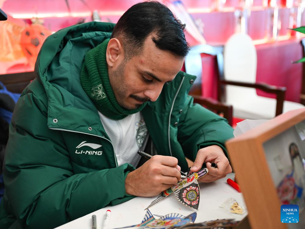 Lianson official Meshari Almutairi of Saudi Arabia delegation makes a mini kite during a cultural event to celebrate the Lanter Festival at the athletes' village of the 9th Asian Winter Games in Harbin, northeast China's Heilongjiang Province, Feb. 12, 2025. (Xinhua/Wang Xi)