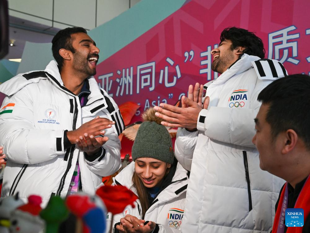 Indian speed skaters Chandra Mouli Danda (1st L), Shruti Nitin Kotwal (2nd L) and Anubhav Gupta make flour figurines during a cultural event to celebrate the Lanter Festival at the athletes' village of the 9th Asian Winter Games in Harbin, northeast China's Heilongjiang Province, Feb. 12, 2025. (Xinhua/Wang Xi)