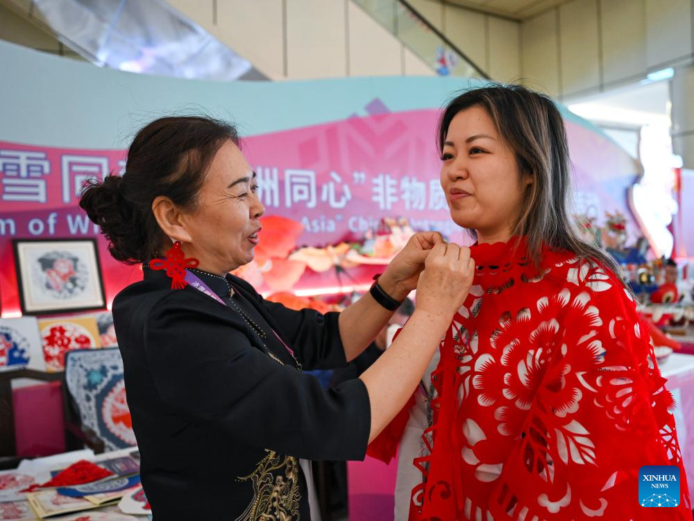 Delegation official Jean Kyle Wico (R) of the Philippines takes photos of the paper cutting work during a cultural event to celebrate the Lanter Festival at the athletes' village of the 9th Asian Winter Games in Harbin, northeast China's Heilongjiang Province, Feb. 12, 2025. (Xinhua/Wang Xi)