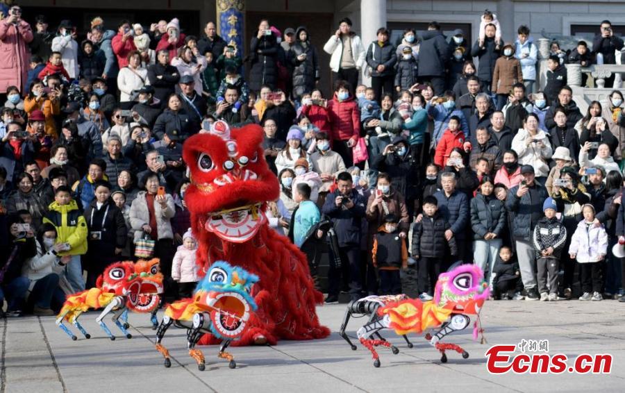 Robot dogs, with lion head-shaped decorations, perform dance alongside traditional lion dancers during a Lantern Festival celebration in Jinan, central China's Shandong Province, Feb. 12, 2025. (China News Service/Zhang Yong)