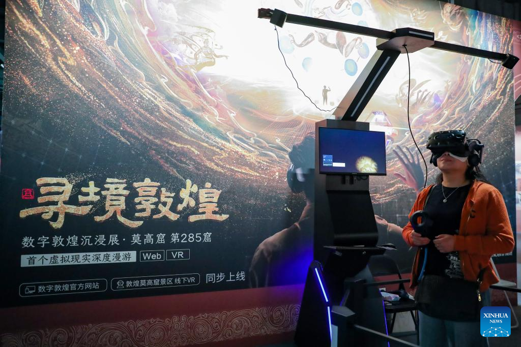 A tourist tries out VR device to experience virtual tour of the Mogao Caves in Dunhuang, northwest China's Gansu Province, Sept. 22, 2024. Around 2,000 years ago, Dunhuang was a key hub on the ancient Silk Road. Chinese silk and tea passed through this gateway en route to other countries, while agricultural products such as grapes, carrots and pomegranates made their way into China.