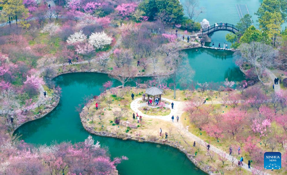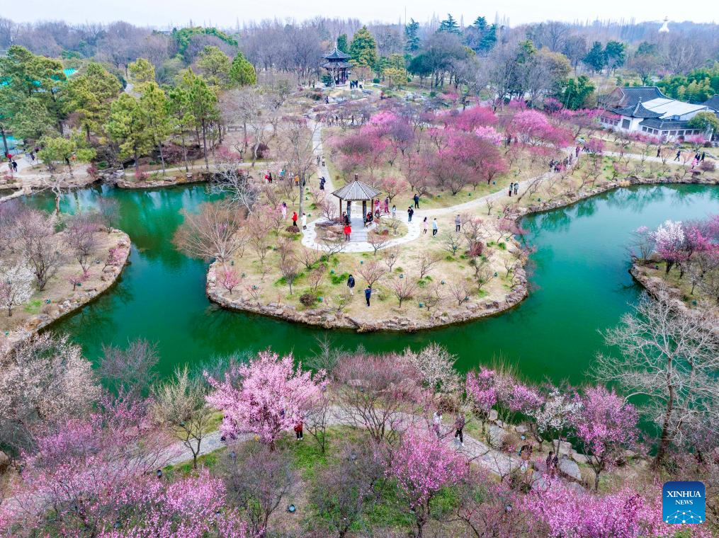 A drone photo taken on Feb 23, 2025 shows plum blossoms at a park in Guang'an District, Guang'an City, southwest China's Sichuan Province. (Photo by Zhang Guosheng/Xinhua)