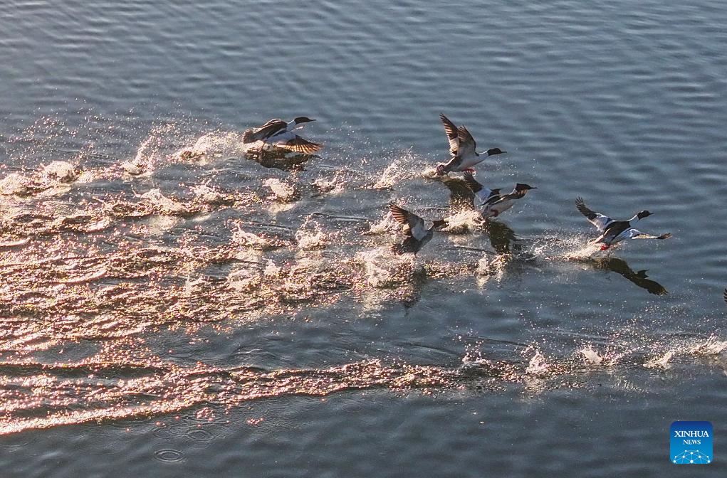 A drone photo taken on Feb 24, 2025 shows waterfowls on a lake in Zunhua, north China's Hebei Province. (Photo by Liu Mancang/Xinhua)