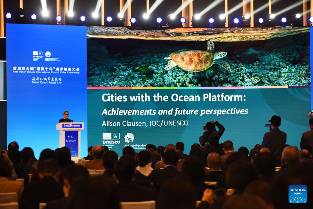 This photo taken on Feb. 26, 2025 shows the scene of the First Ocean Decade International Coastal Cities Conference in Qingdao, east China's Shandong Province. Hosted by the Qingdao Municipal People's Government in collaboration with UNESCO'S Intergovernmental Oceanographic Commission (IOC-UNESCO), the conference themed "Better Ocean, Better City" was held here on Wednesday to facilitate knowledge exchange and experience sharing on blue economy, climate change, and science-based solutions for sustainable development of coastal cities. (Xinhua/Li Ziheng)