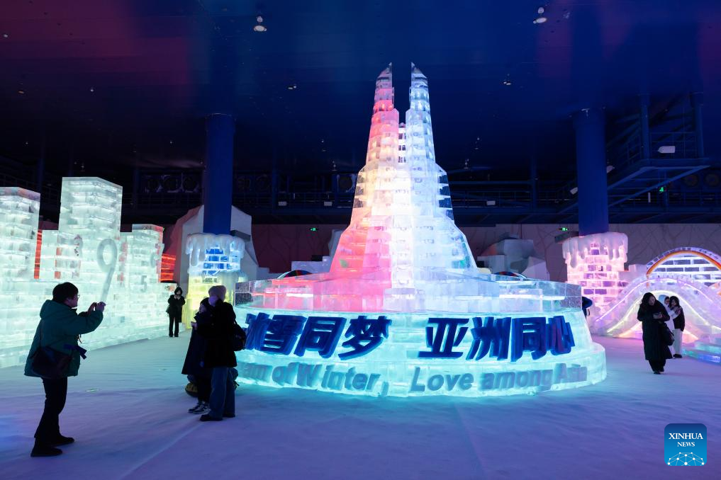 Visitors pose for photos in front of the ice sculpture themed "Dream of Winter, Love among Asia" at an indoor ice-and-snow theme park within Harbin Ice-Snow World in Harbin, northeast China's Heilongjiang Province, Feb. 27, 2025. The world's largest indoor ice-and-snow theme park, a facility located within Harbin Ice-Snow World, reopened on Thursday morning as the outdoor Harbin Ice-Snow World officially closed its 26th edition on Wednesday. Covering an area of 23,000 square meters, the indoor ice-and-snow attraction has seen a comprehensive refurbishment. Initially launched in July 2024, the facility features advanced audio-visual interactivity, vibrant ice sculptures, and elements from past editions of the park and the 2025 Asian Winter Games. (Xinhua/Zhang Tao)