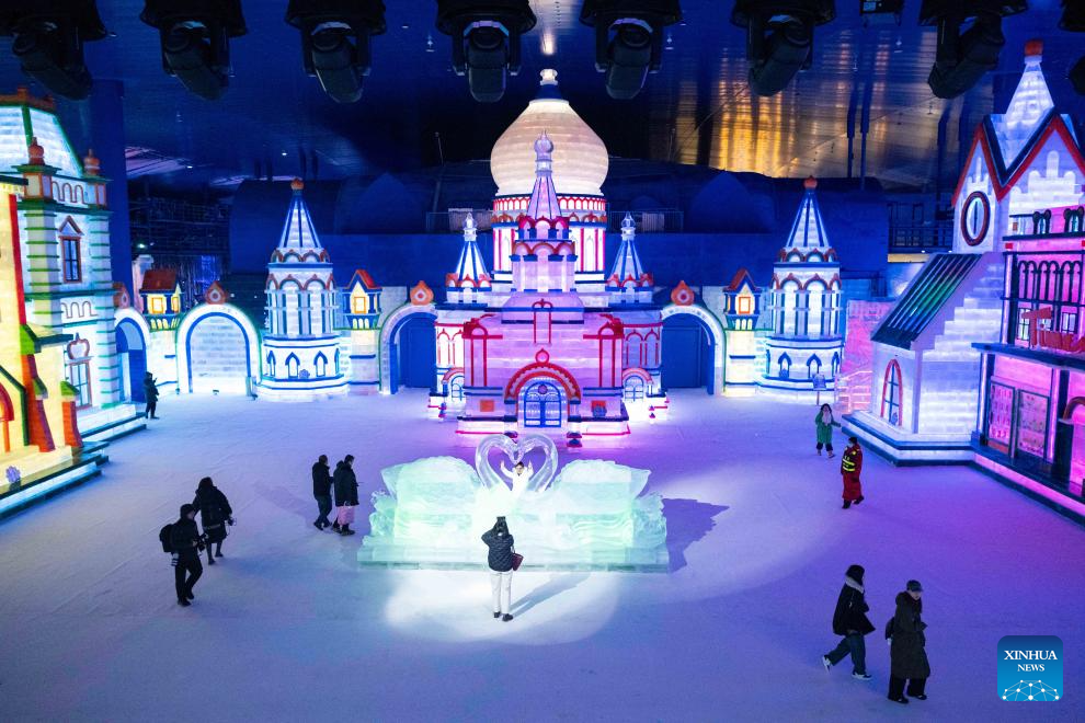 Tourists appreciate the ice-and-snow sculptures at an indoor ice-and-snow theme park within Harbin Ice-Snow World in Harbin, northeast China's Heilongjiang Province, Feb. 27, 2025. The world's largest indoor ice-and-snow theme park, a facility located within Harbin Ice-Snow World, reopened on Thursday morning as the outdoor Harbin Ice-Snow World officially closed its 26th edition on Wednesday. Covering an area of 23,000 square meters, the indoor ice-and-snow attraction has seen a comprehensive refurbishment. Initially launched in July 2024, the facility features advanced audio-visual interactivity, vibrant ice sculptures, and elements from past editions of the park and the 2025 Asian Winter Games. (Xinhua/Xie Jianfei)