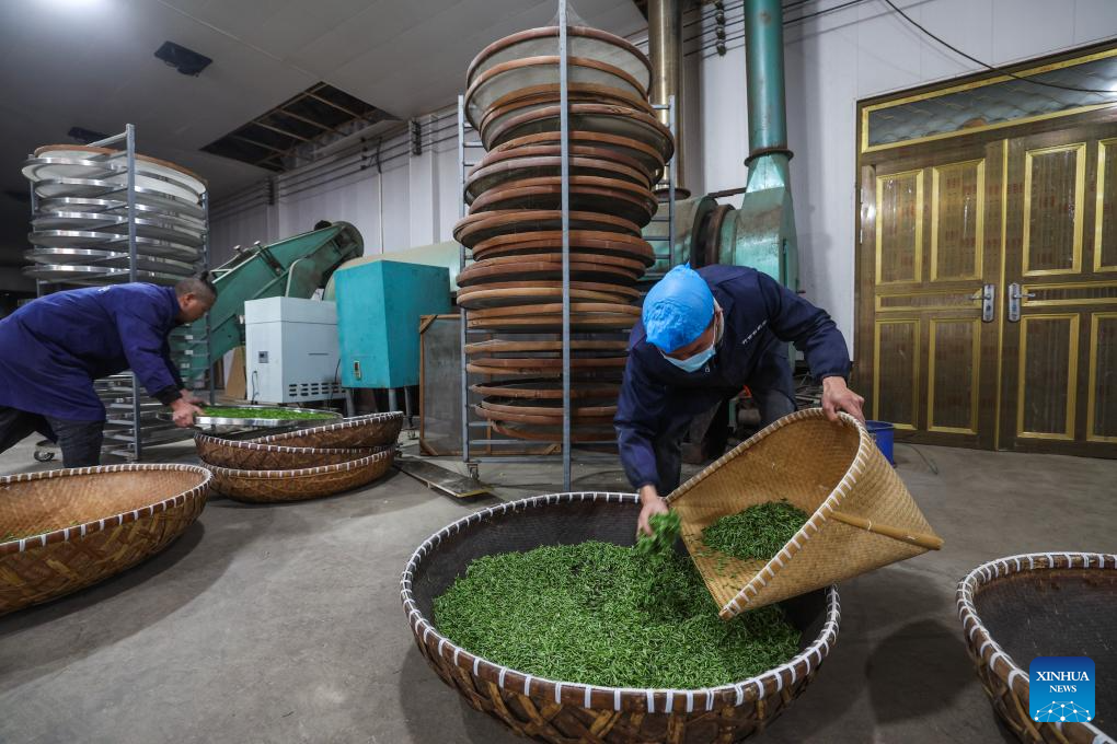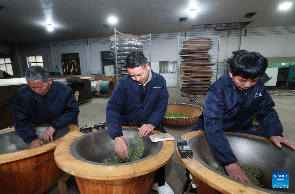 Workers process tea leaves at the workshop of a tea garden in Wangzhai Town of Wuyi County, Jinhua City, east China's Zhejiang Province, March 5, 2025. As spring unfolds, tea gardens across Wuyi County have entered the harvest season. In recent years, Wuyi County has advanced the tea industry as its pillar industry. By the end of 2024, the total area of tea plantation in Wuyi County has reached 125,700 mu (approximately 8,380 hectares). More than 60,000 farmers have directly benefited from tea-related businesses. (Xinhua/Xu Yu)