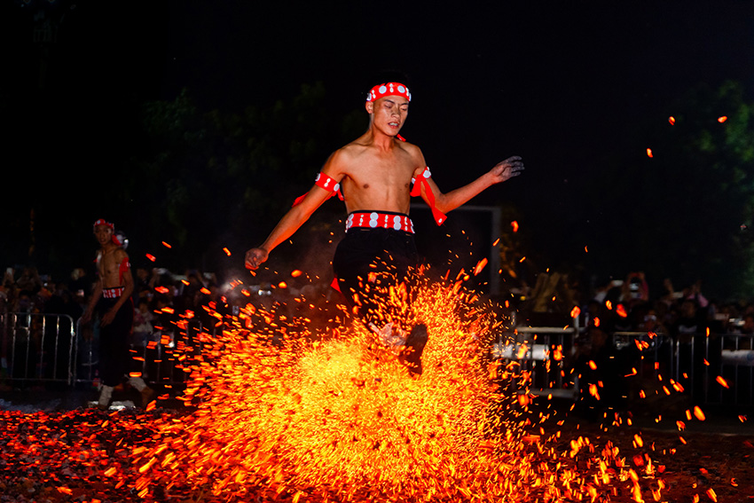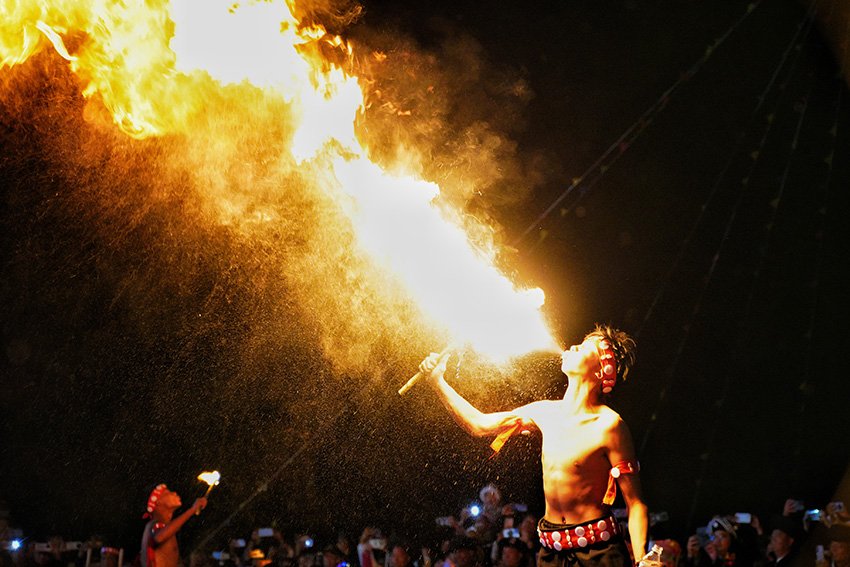 As night fell, a group of barefoot Lisu performers stepped forward to cross the "sea of flames." With steely determination, they let out a thunderous shout, and plunged into the flames.