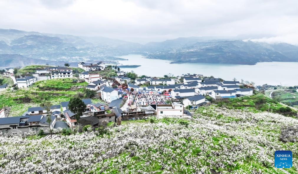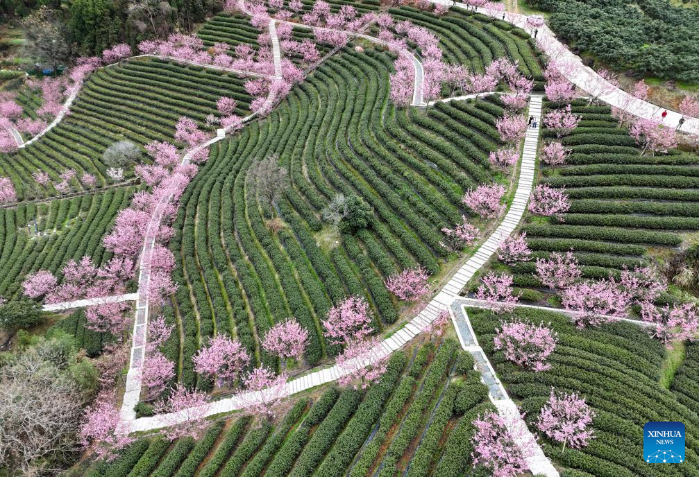 An aerial drone photo taken on March 15, 2025 shows tourists enjoying the scenery of cherry blossoms in Dajing Town of Leqing City, east China's Zhejiang Province. As the spring season is coming, flowers are in full bloom across the country. (Photo by Cai Kuanyuan/Xinhua)