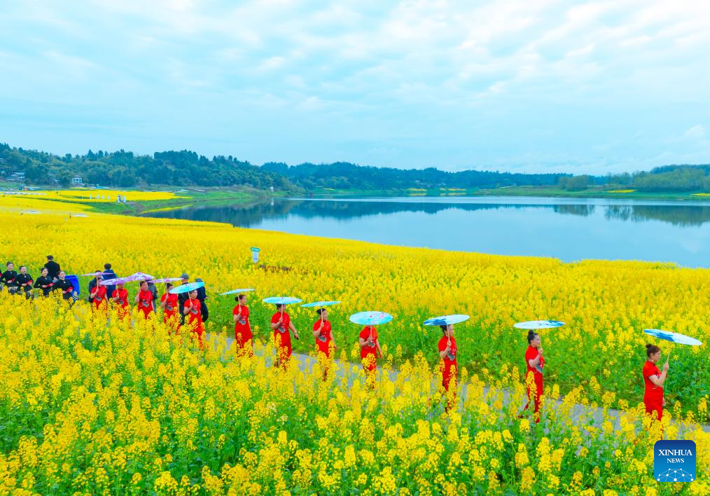 A drone photo taken on March 15, 2025 shows women wearing Chinese traditional Qipao dresses walk through the rapeseed flower fields in Guang'an City, southwest China's Sichuan Province. As the spring season is coming, flowers are in full bloom across the country. (Photo by Qiu Haiying/Xinhua)