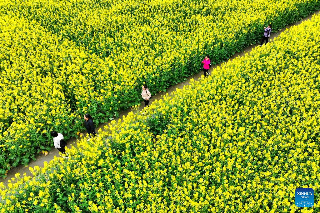 Tourists enjoy the scenery of rapeseed flowers in Youyang Tujia and Miao Autonomous County, southwest China's Chongqing Municipality, March 15, 2025. As the spring season is coming, flowers are in full bloom across the country. (Photo by Chen Bisheng/Xinhua)