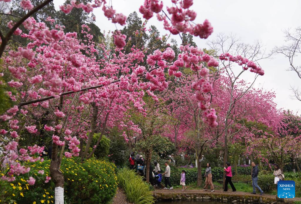 Tourists enjoy cherry blossoms at a botanic garden in Kunming, southwest China's Yunnan Province, on March 15, 2025. As the spring season is coming, flowers are in full bloom across the country. (Photo by Liang Zhiqiang/Xinhua)