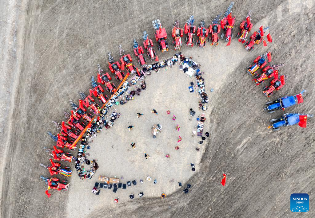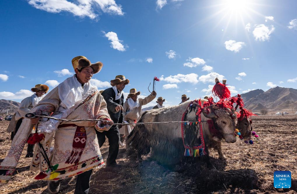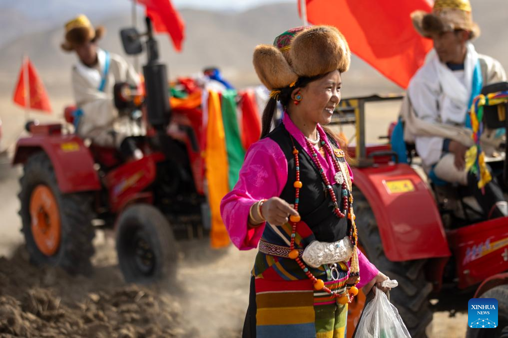 Farmers participate in a ceremony marking the start of spring farming in Quxar Town of Lnaze County, southwest China's Xizang Autonomous Region, March 16, 2025. Ceremonies marking the start of spring farming were held across Xizang on Sunday. The ceremony holds great significance as it marks the beginning of a new year's farming season and serves as a prayer for favorable weather and bountiful harvests. It is considered an important ritual in the farming regions of Xizang. (Xinhua/Jiang Fan)