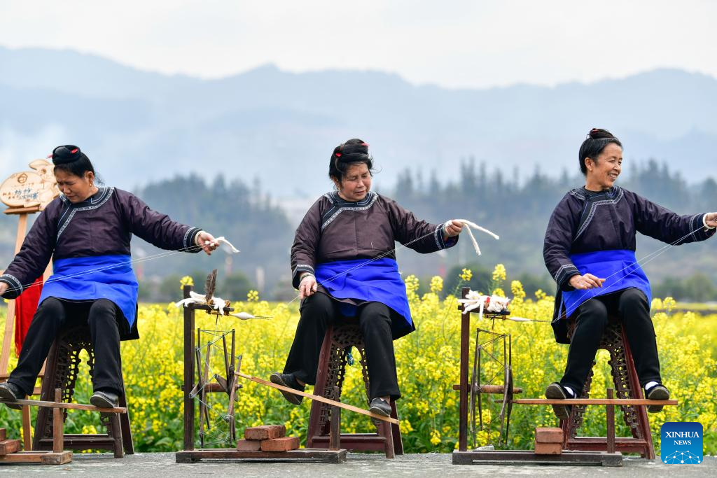 Villagers display spinning skills during a rural fashion show in Rongjiang County, southwest China's Guizhou Province, March 16, 2025.