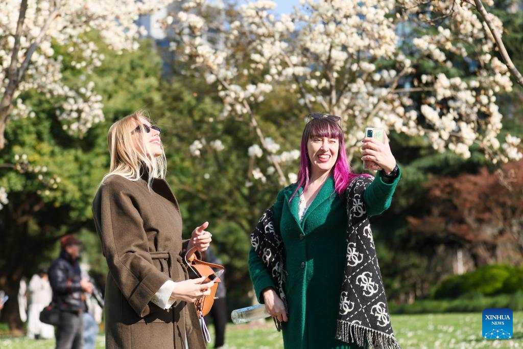 Tourists take selfies with magnolia trees in Lujiazui, east China's Shanghai, March 18, 2025. (Xinhua/Wang Xiang)