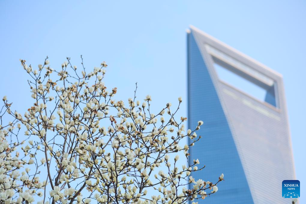 Magnolia blossoms are pictured in Lujiazui, east China's Shanghai, March 18, 2025. (Xinhua/Wang Xiang)