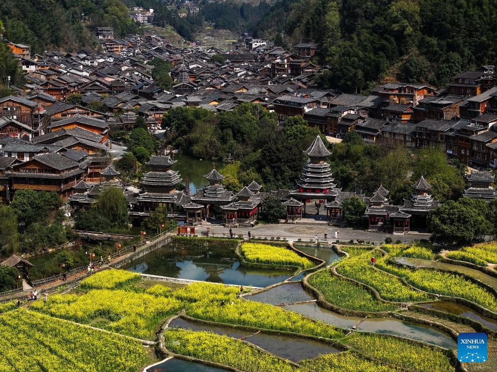 Visitors take photos at the Zhaoxing Dong Village in Liping County of Qiandongnan Miao and Dong Autonomous Prefecture, southwest China's Guizhou Province, March 17, 2025. Located in Liping County of Qiandongnan Miao and Dong Autonomous Prefecture, Zhaoxing Dong Village is home to over a thousand households of the Dong ethnic group. The traditional architectural style and rich cultural heritage of the Dong ethnic group are well-preserved.