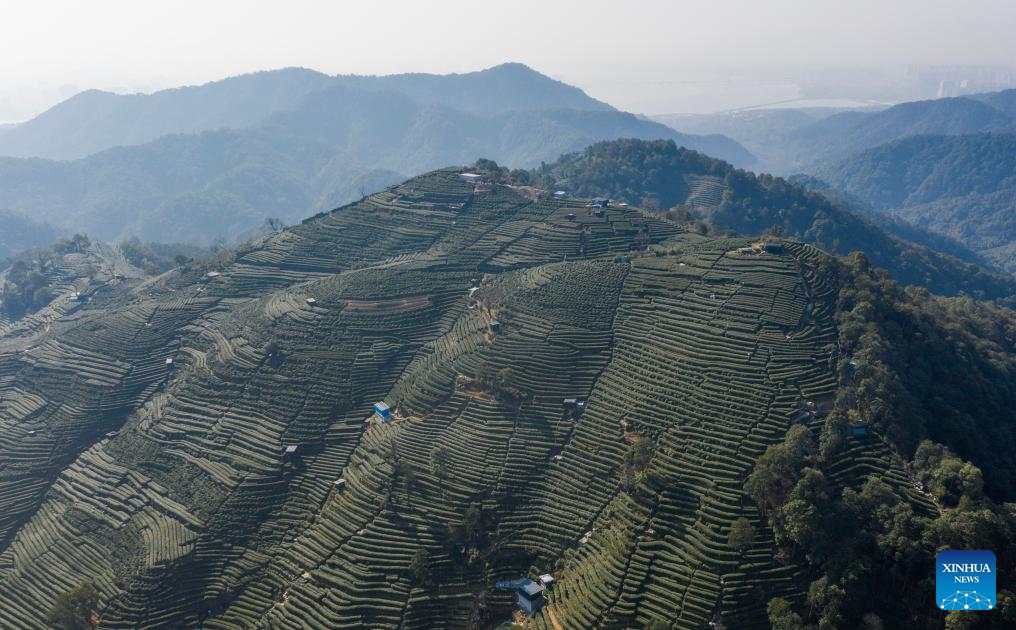 An aerial drone photo taken on March 20, 2025 shows Wengjiashan Mountains, the first-class protected area of West Lake Longjing tea base, in Hangzhou, east China's Zhejiang Province. (Xinhua/Xu Yu)
