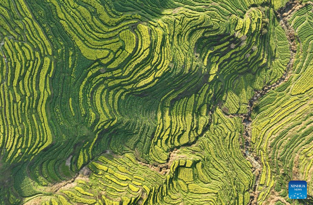 An aerial drone photo taken on March 19, 2025 shows blooming cole flowers in terraced fields at Huangling scenic spot in Wuyuan County, east China's Jiangxi Province. (Xinhua/Wan Xiang)