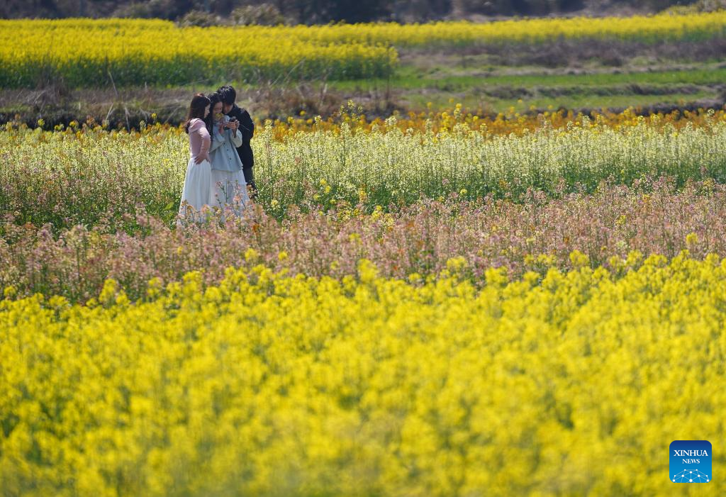 Tourists enjoy blooming cole flowers in Yantian Village of Wuyuan County, east China's Jiangxi Province, March 20, 2025. (Xinhua/Wan Xiang)