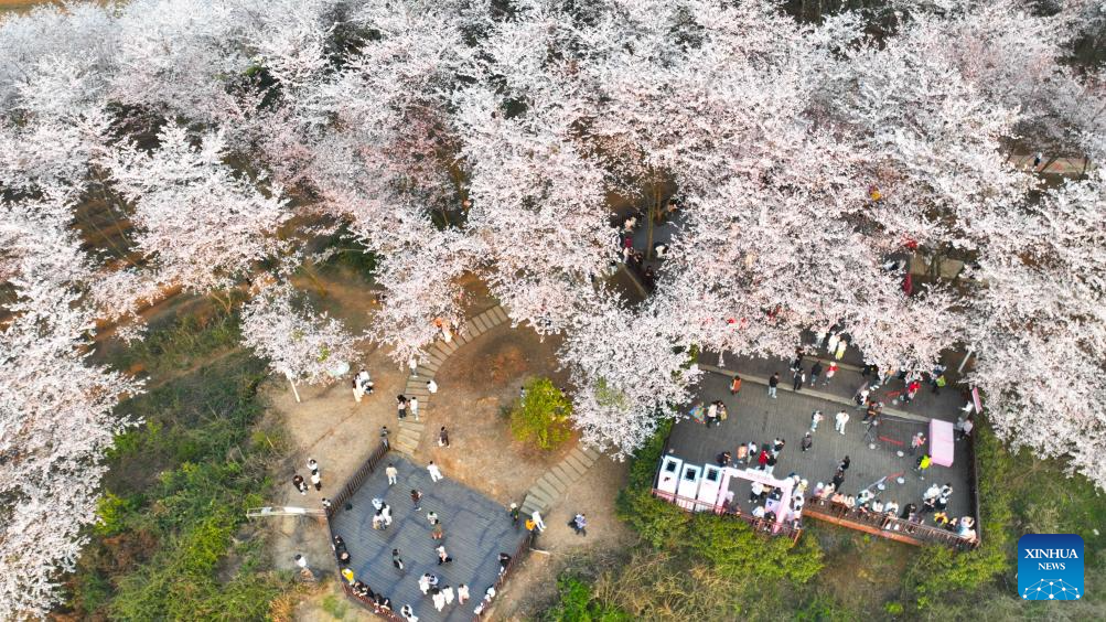 An aerial drone photo taken on March 25, 2025 shows tourists viewing cherry blossoms at a cherry garden in Gui'an New Area, southwest China's Guizhou Province. Recently, the 10,000 mu of cherry trees in Gui'an New Area have been in full bloom, attracting many tourists to come and enjoy the spring time.