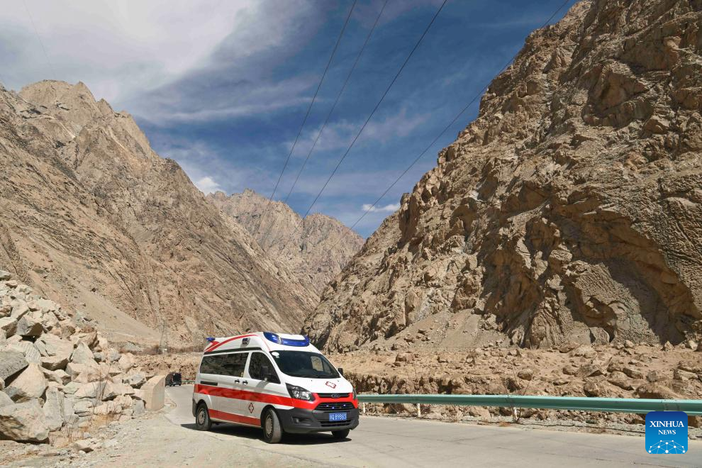 An ambulance carrying doctors from Shenzhen heads for Kukexiluge Township in Taxkorgan Tajik Autonomous County, northwest China's Xinjiang Uygur Autonomous Region, March 24, 2025. (Xinhua/Hu Huhu)