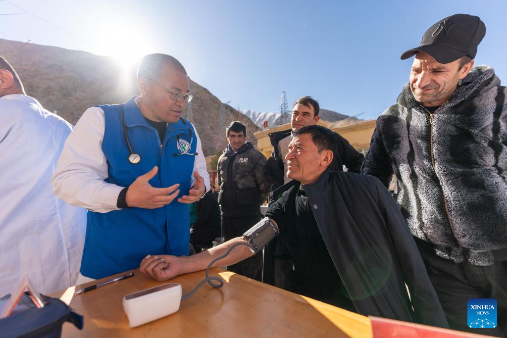 Huang Weichao (2nd L), a physician from Shenzhen, measures the blood pressure for a villager at Kukexiluge health center in Kukexiluge Township, Taxkorgan Tajik Autonomous County, northwest China's Xinjiang Uygur Autonomous Region, March 24, 2025. (Xinhua/Xu Hongyan)