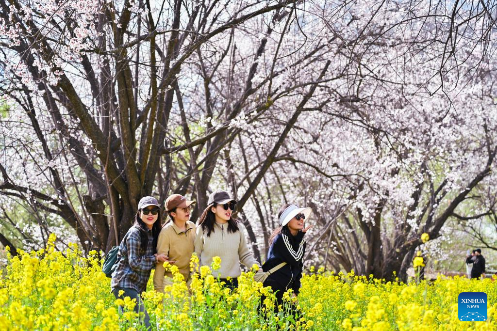 Tourists appreciate peach blossoms in Nyingchi, southwest China's Xizang Autonomous Region, March 29, 2025. As the weather warms up, peach blossoms in Nyingchi are in full bloom, attracting numerous tourists. (Xinhua/Qi Zhiyue)