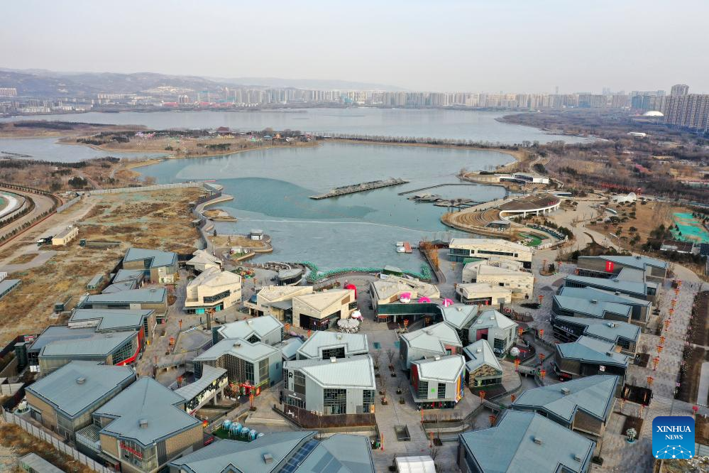 An aerial drone photo taken on Feb. 19, 2025 shows a view of the Jinyang Lake Park in Taiyuan City, north China's Shanxi Province.