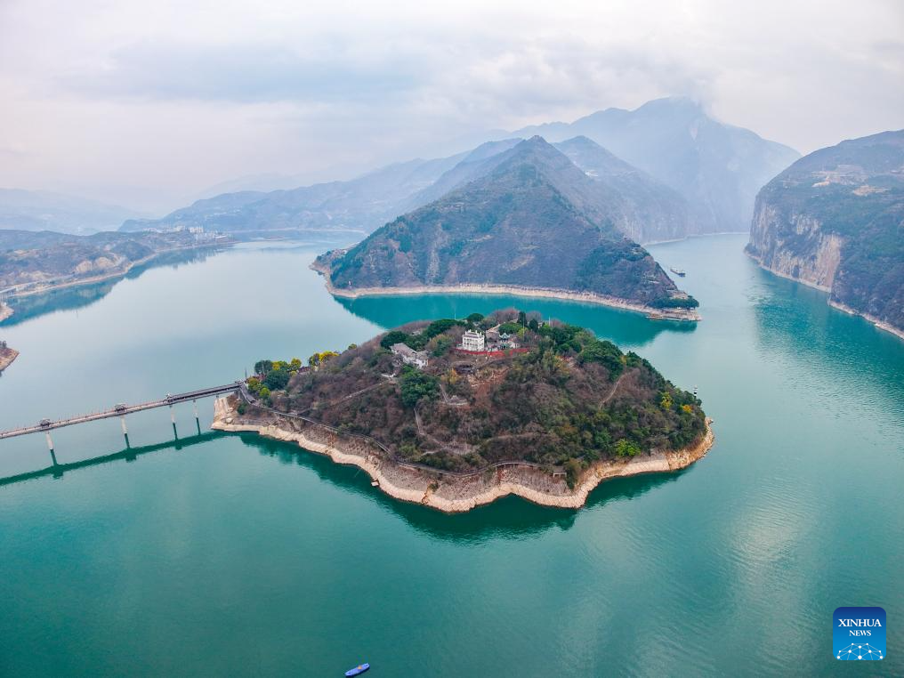 An aerial drone photo shows a view of Qutang Gorge, one of the Three Gorges on the Yangtze River, in Fengjie County, southwest China's Chongqing Municipality, Feb. 13, 2025. (Xinhua/Wang Quanchao)
