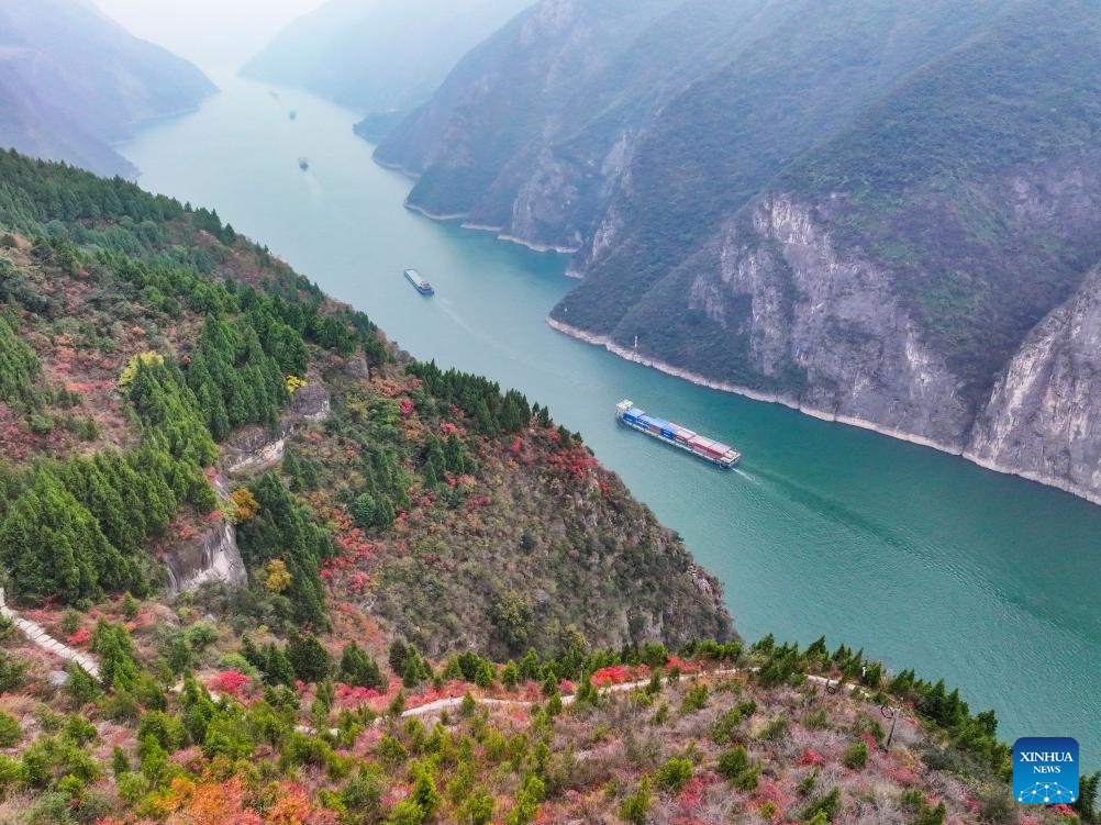 An aerial drone photo shows ships sailing in Qutang Gorge, one of the Three Gorges on the Yangtze River, in Fengjie County, southwest China's Chongqing Municipality, Dec. 19, 2024. (Xinhua/Wang Quanchao)