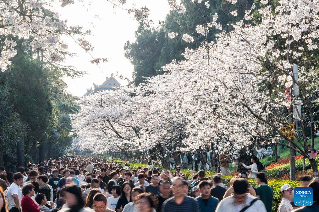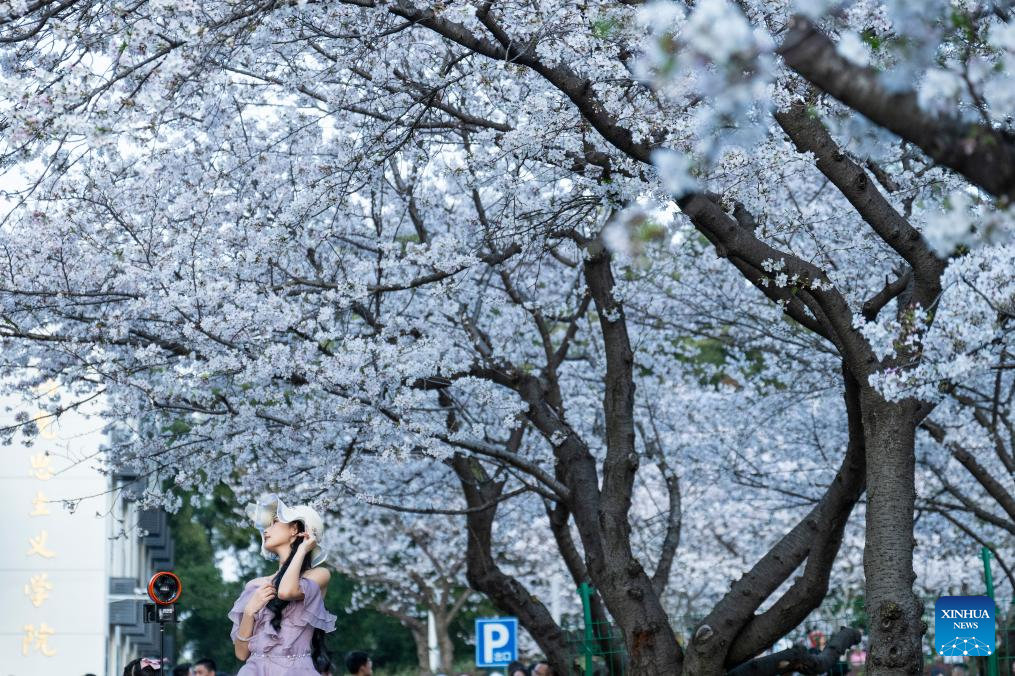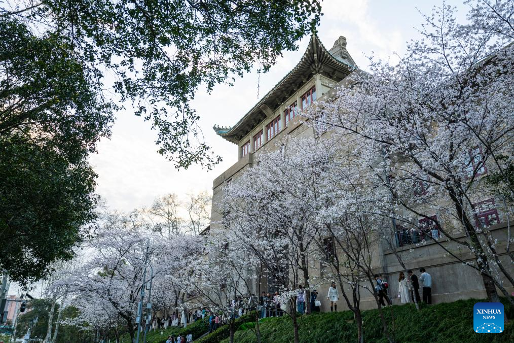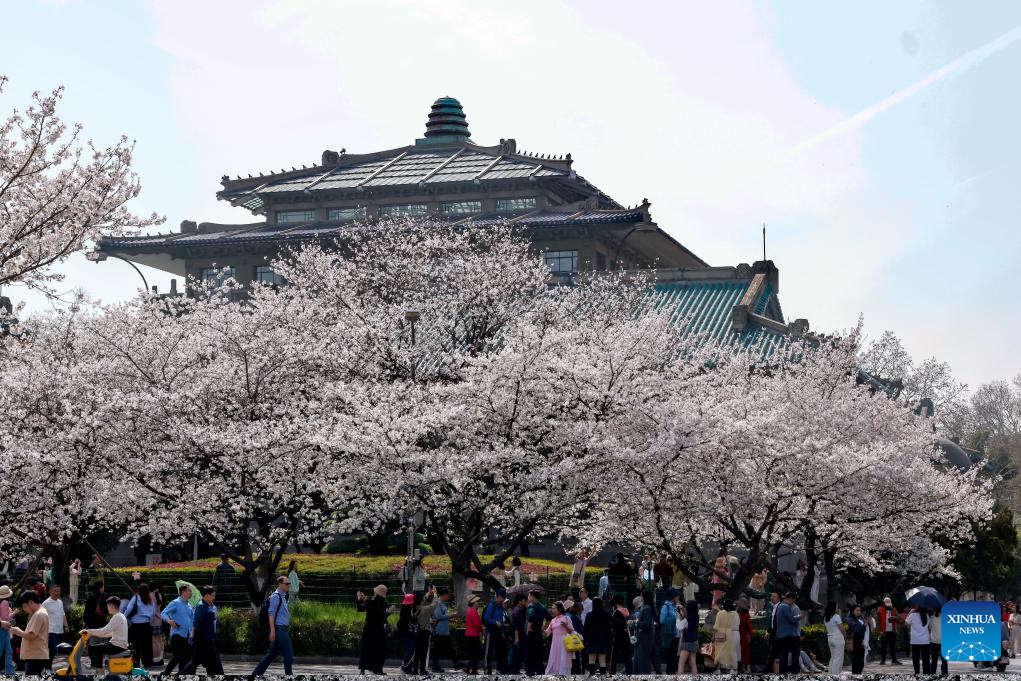 People enjoy cherry blossoms at Wuhan University in Wuhan, capital of central China's Hubei Province, March 22, 2025. (Xinhua/Wu Zhizun)