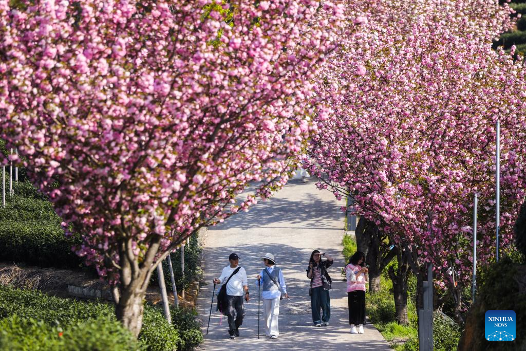 Tourists view cherry blossoms at a tea garden in Bashan Village, Fuyang District of Hangzhou City, east China's Zhejiang Province, April 6, 2025. Cherry trees in the vast tea plantations on the mountains in Baishan Village are in full bloom, which attract lots of tourists. (Xinhua/Xu Yu)