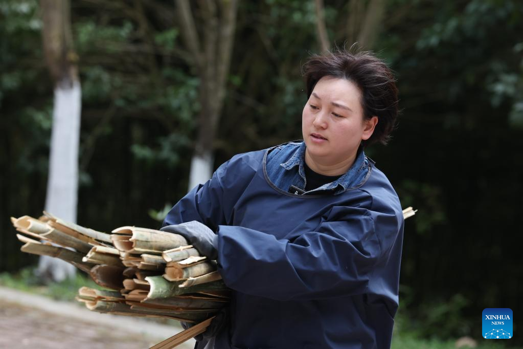 Giant panda keeper Li Rong processes bamboo before feeding the pandas at the Shenshuping giant panda base of Wolong National Nature Reserve in southwest China's Sichuan Province, March 27, 2025. (Xinhua/Xu Bingjie)