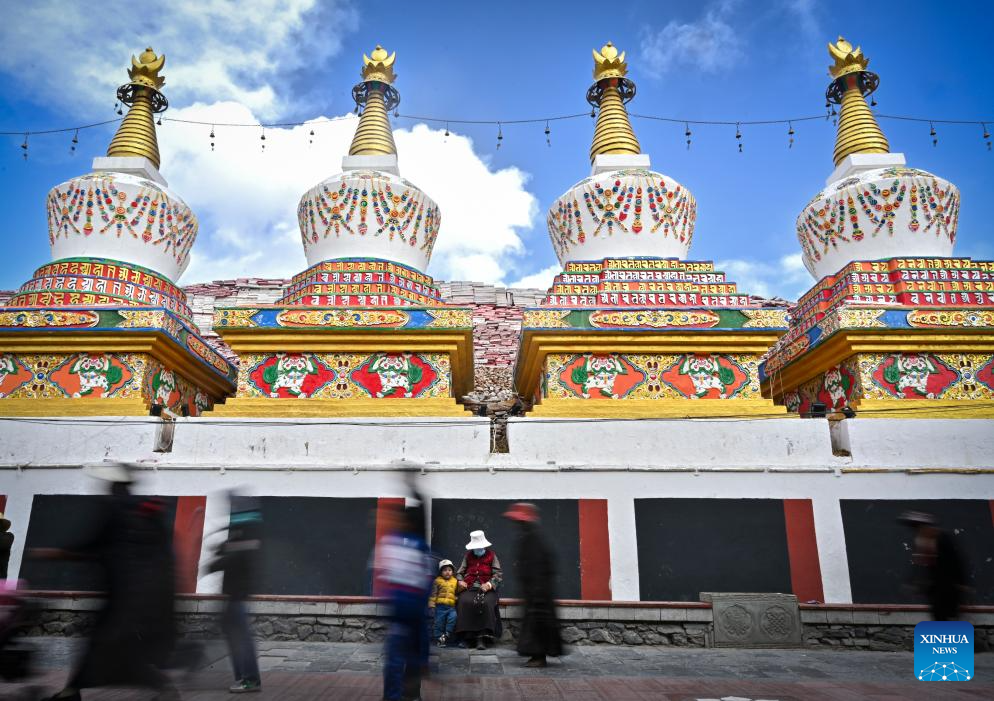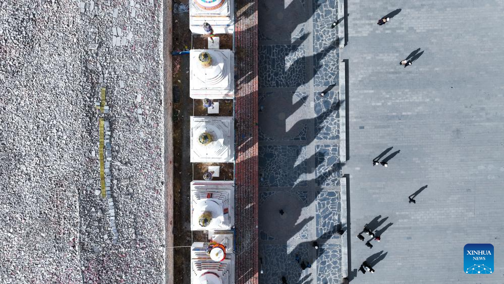 People pray as they circle the Jiana mani stone mound in Yushu City, Yushu Tibetan Autonomous Prefecture, northwest China's Qinghai Province, April 6, 2025. The Jiana mani stone mound is a cultural relic under national protection. The mound is composed of billions of mani stones and used by local people when they hold prayers' wheels and mutter the six-syllable prayer to observe their daily ritual. (Xinhua/Qi Zhiyue)