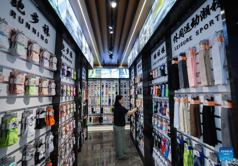 A staff member arranges sports socks at the exhibiting hall of Zhuji Yuanjin Textile Co., Ltd. in Zhuji City, east China's Zhejiang Province on April 10, 2025. (Xinhua/Xu Yu)