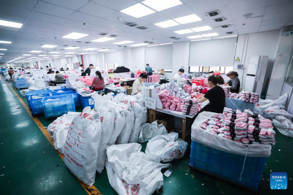Workers pack socks at Zhuji Yuanjin Textile Co., Ltd. in Zhuji City, east China's Zhejiang Province on April 10, 2025. (Xinhua/Xu Yu)