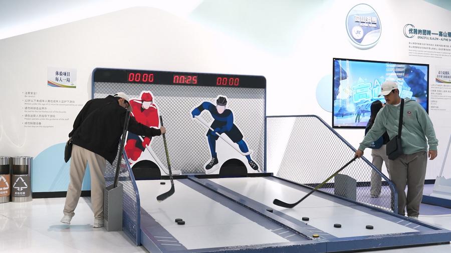 UAE students tried ice hockey simulation at Beijing Olympic Museum, in Beijing, capital of China, on April 6, 2025. (Xinhua/ Hu Zhenze)