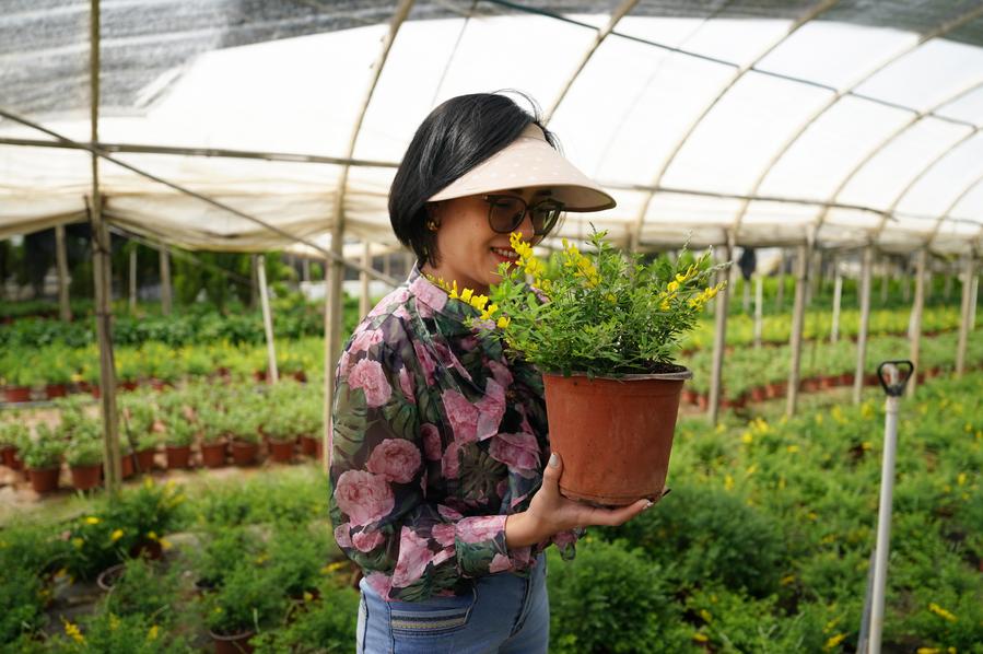 A woman buys flowers from China's Yunnan Province at Quang Ba Flower Market in Hanoi, Vietnam, March 28, 2025. (Xinhua/Zhu Wei)