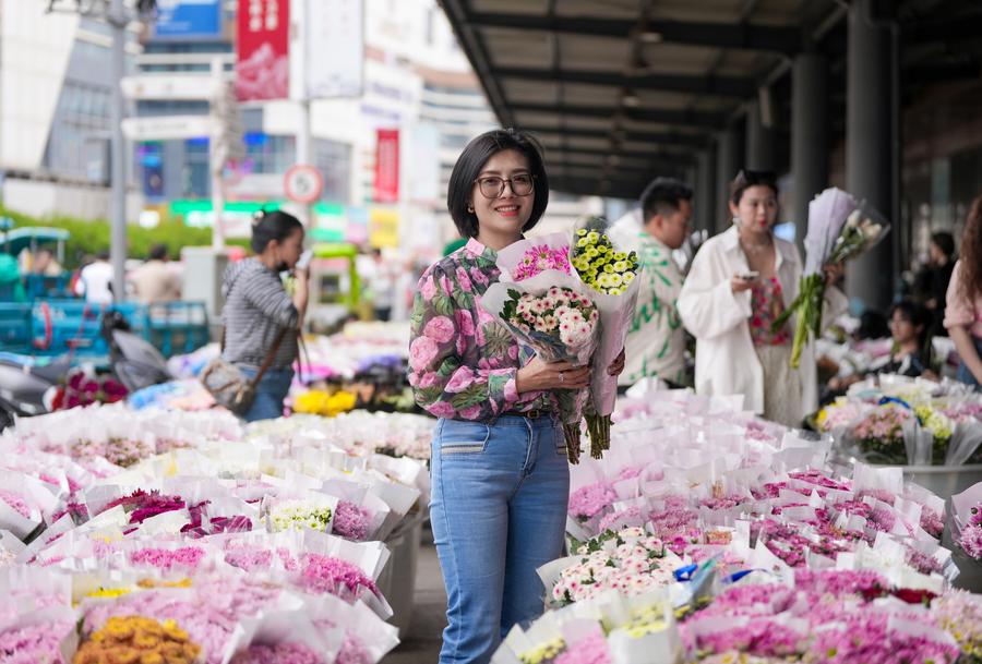 Nguyen Thuy Van, a Vietnamese florist, is pictured at Dounan Flower Market in Kunming, southwest China's Yunnan Province, April 11, 2025. (Xinhua/Chen Xinbo)