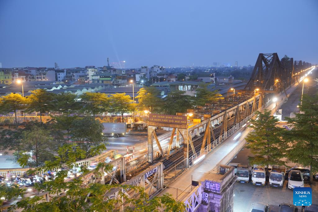 This photo taken on April 9, 2025 shows a view of Long Bien Bridge, a historic bridge across the Red River, in Hanoi, Vietnam. The Vietnamese capital city of Hanoi, an ancient city with a history of more than a thousand years, boasts diverse culture and historical sites. (Xinhua/Xu Rui)