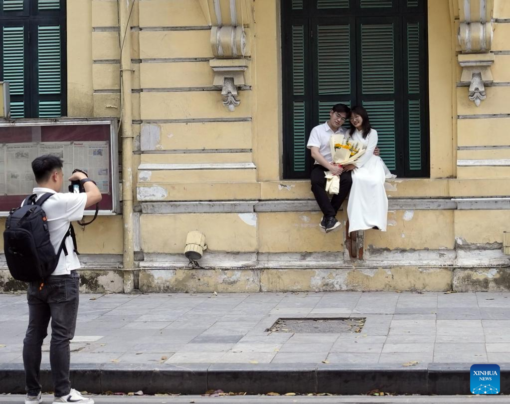 A couple pose for photos on the street in Hanoi, Vietnam, April 9, 2025. The Vietnamese capital city of Hanoi, an ancient city with a history of more than a thousand years, boasts diverse culture and historical sites. (Xinhua/Xu Rui)