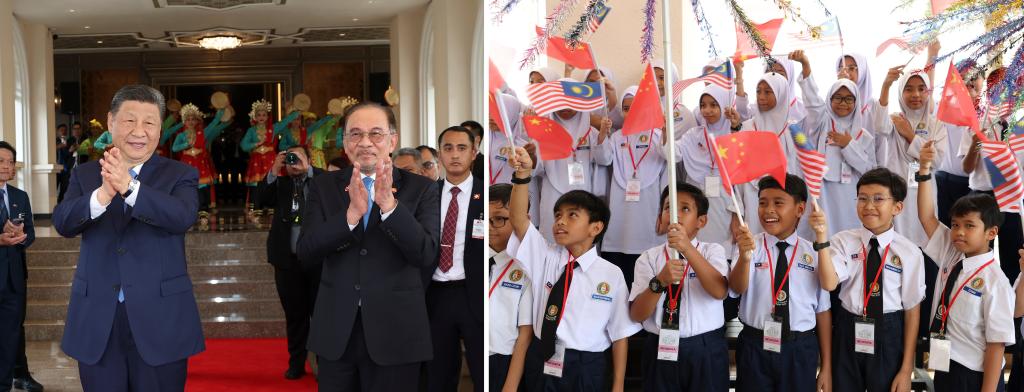 In this combo photo, Chinese President Xi Jinping is warmly welcomed by Malaysian Prime Minister Anwar Ibrahim and Malaysian teenagers as he arrives at the prime minister's official residence in Putrajaya, Malaysia, April 16, 2025. Xi held talks with Anwar here Wednesday. (Xinhua/Huang Jingwen)