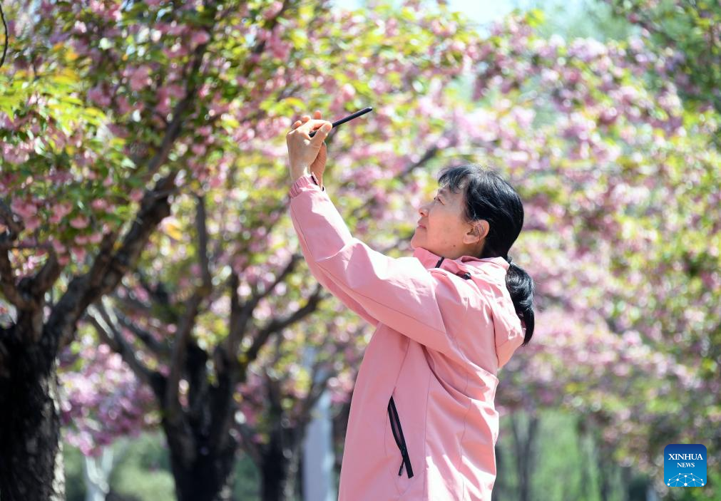 A citizen takes photos of cherry blossoms in Beijing, capital of China, April 19, 2025. (Xinhua/Ren Chao)
